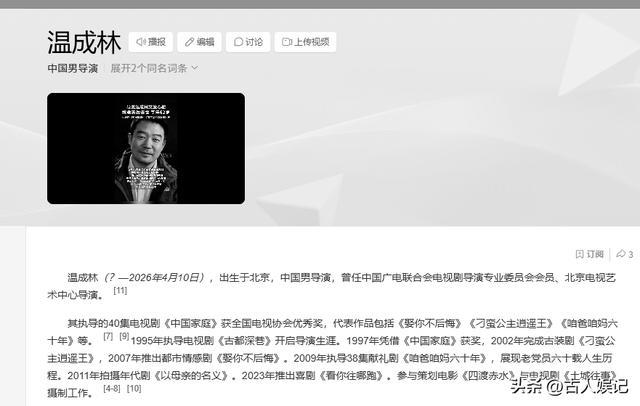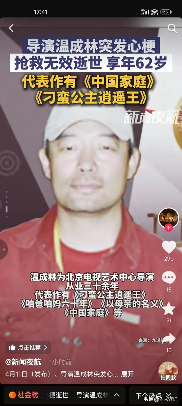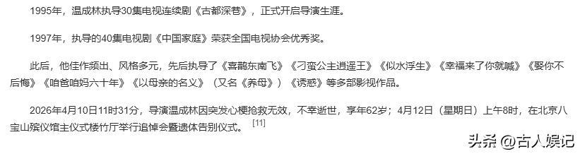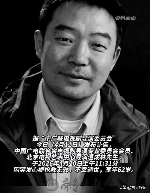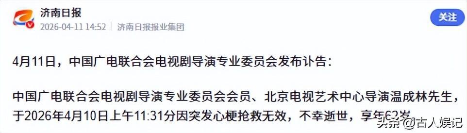 4月11日,中国广电联合会电视剧导演专业委员会发布讣告:北京电视艺术中心导演温成林,因突发心梗抢救无效,于4月10日上午11时31分逝世,享年62岁。