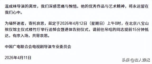 讣告中写明,温成林导演的追悼会暨遗体告别仪式定于4月12日上午8时在北京八宝山殡仪馆主仪式楼竹厅举行。