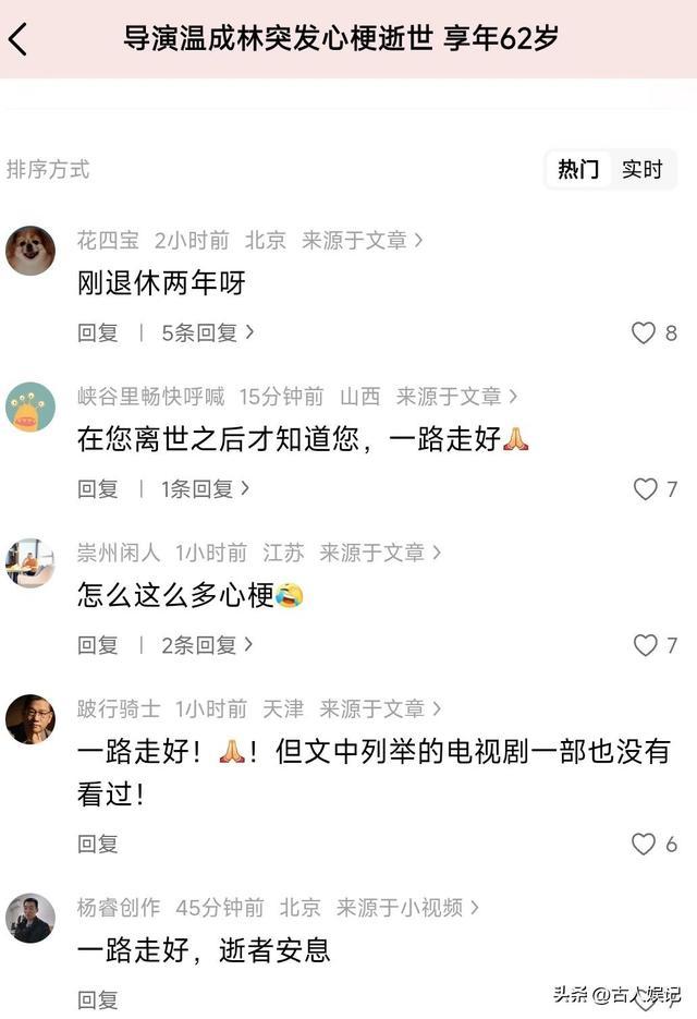 得知温成林去世的消息后,不少网友在社交平台上留言:“看过您拍的电视剧,那是我小时候最快乐的时光”“一位真正用心讲故事的导演,一路走好”。